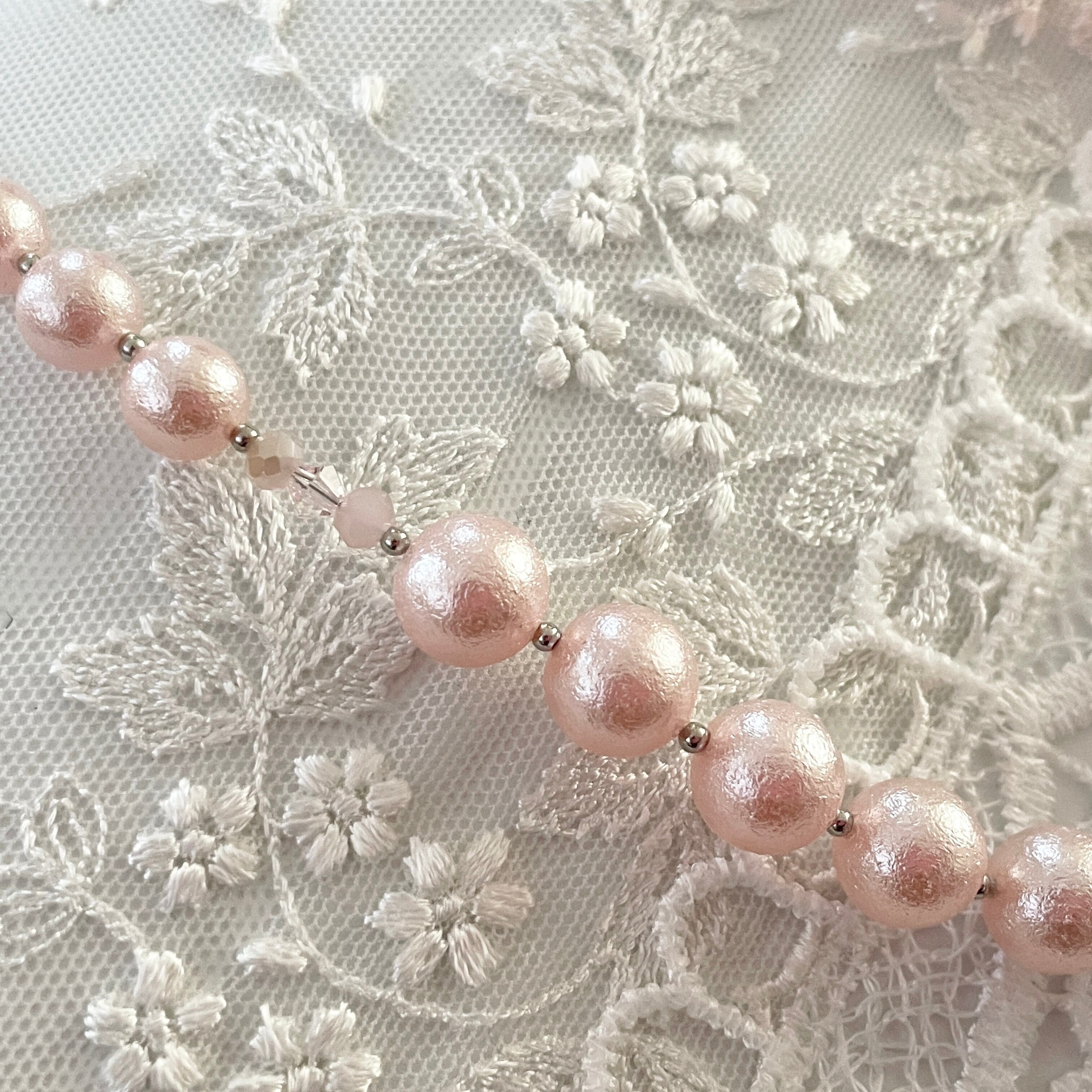 ベビーピンクのエンジェルパールを繋いだネックレスです。